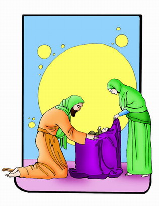 أحكم سيدنا إبراهيم الوثاق على كتفي إسماعيل . كان إسماعيل مستسلماً تماماً لأمر الله .