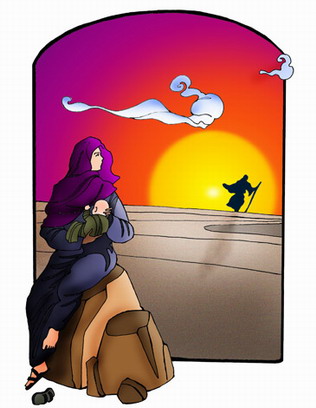و هكذا كان سيدنا إبراهيم يسير ويسير ومعه زوجته هاجر و هي تحمل طفلها الرضيع .