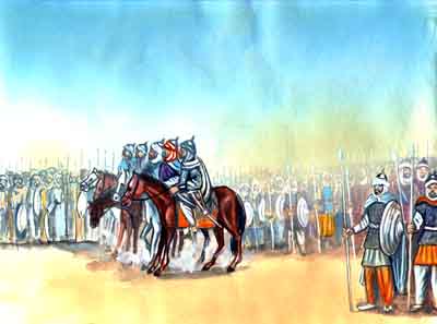 فِي العراقِ، كانَ الاِمامُ الحَسَنُ عليه السلام قَدْ تَحرَّكَ على رَأسِ بَقيَّةِ الجَيشِ فَعَسْكَرَ في